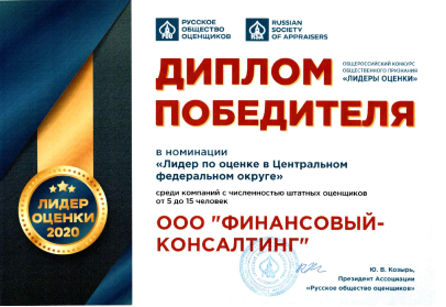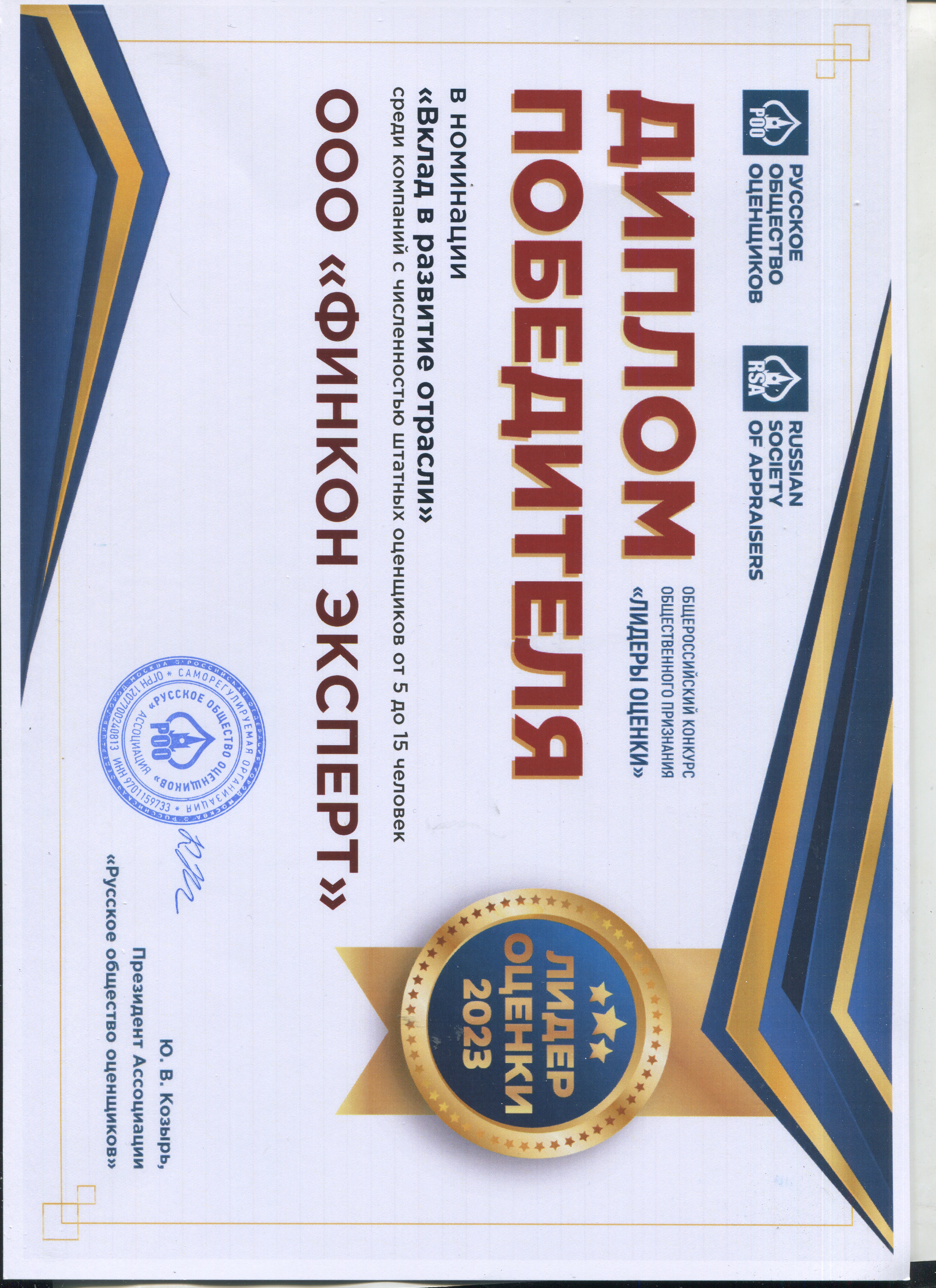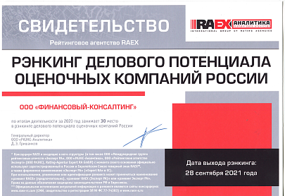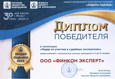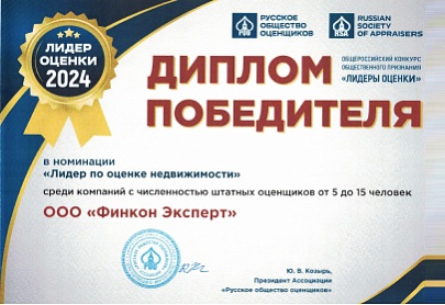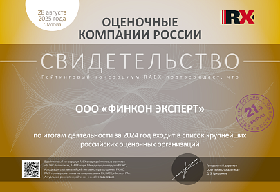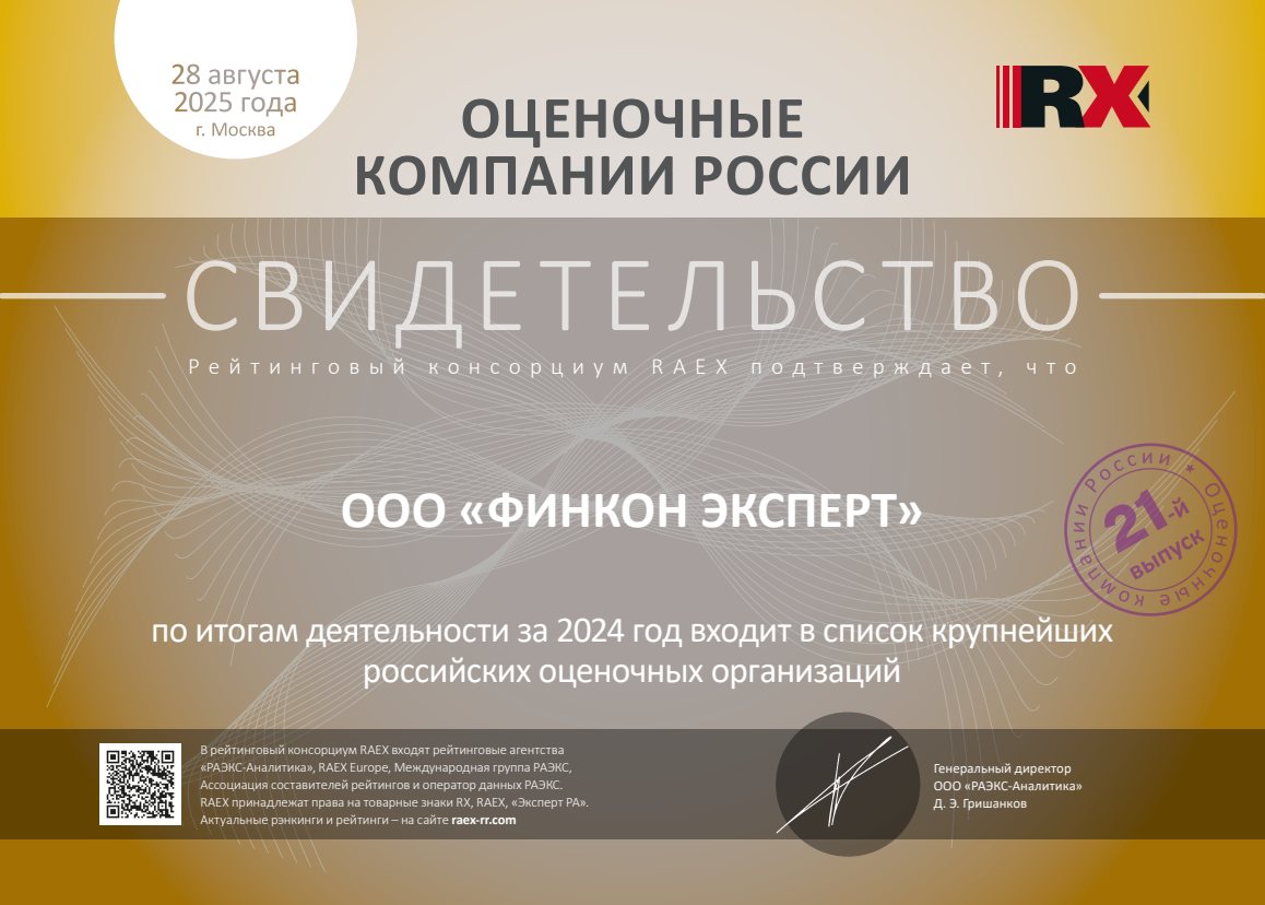 По итогам рейтинга крупнейших оценочных компаний России 2025 года ООО «ФИНКОН ЭКСПЕРТ» в очередной раз вошла в число 100 крупнейших компаний в сфере оценки и консалтинга. Также по результатам общероссийского конкурса общественного признания «Лидеры оценки» ООО «ФИНКОН ЭКСПЕРТ» признана победителем в номинации «Лидер по оценке недвижимости»
